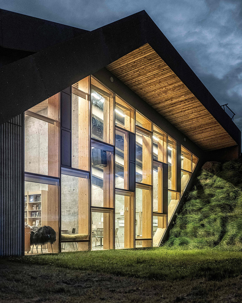 Todos los revestimientos de madera —interiores y exteriores— son de origen islandés, procedentes de bosques cercanos, con trazabilidad completa. Los muros exteriores combinan madera local y acero corten, mientras que los pavimentos de hormigón pulido incorporan gravas de ríos glaciares de la región, integrando el paisaje dentro del propio edificio.