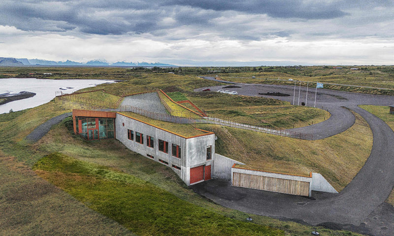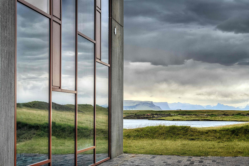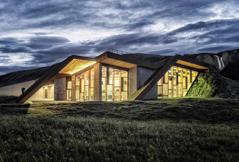 El diseño del edificio se inspira en la tradición constructiva de la región de Skaftárhreppur, donde la arquitectura se funde con el territorio mediante formas orgánicas y materiales locales. La cubierta vegetal, realizada con césped extraído del propio terreno, permite caminar sobre el techo y disfrutar de vistas directas hacia el glaciar Öræfajökull y el pico Hvannadalshnúkur, el más alto de Islandia.