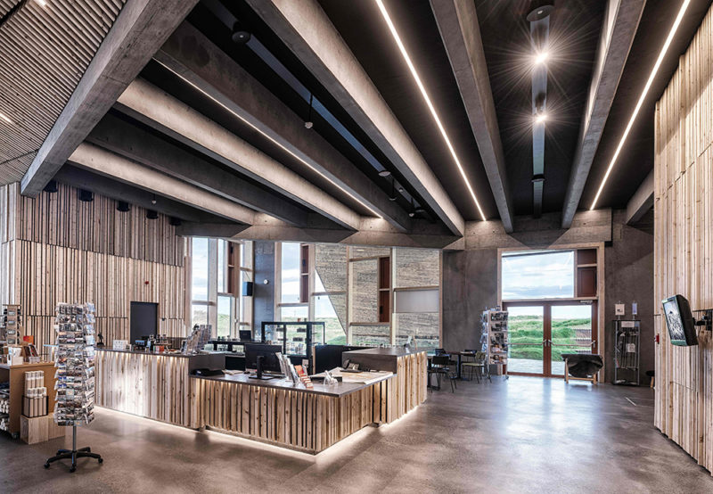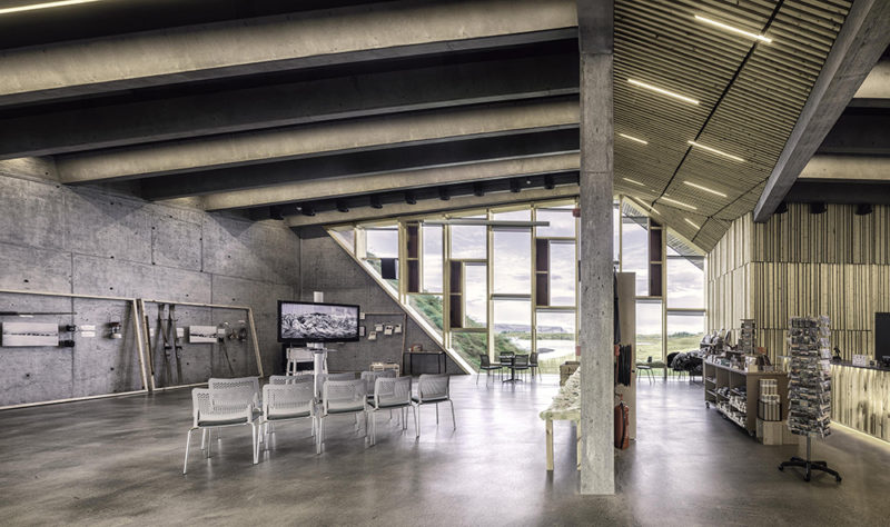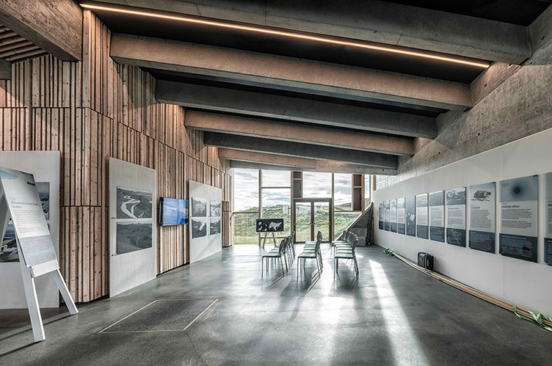 La azotea funciona como recorrido expositivo y mirador, conectando al visitante con la geología del lugar y con los senderos naturales del parque. Además, una plaza de acceso se abre hacia una terraza cubierta con vistas al río Skaftá, reforzando la relación entre arquitectura, territorio y experiencia pública.