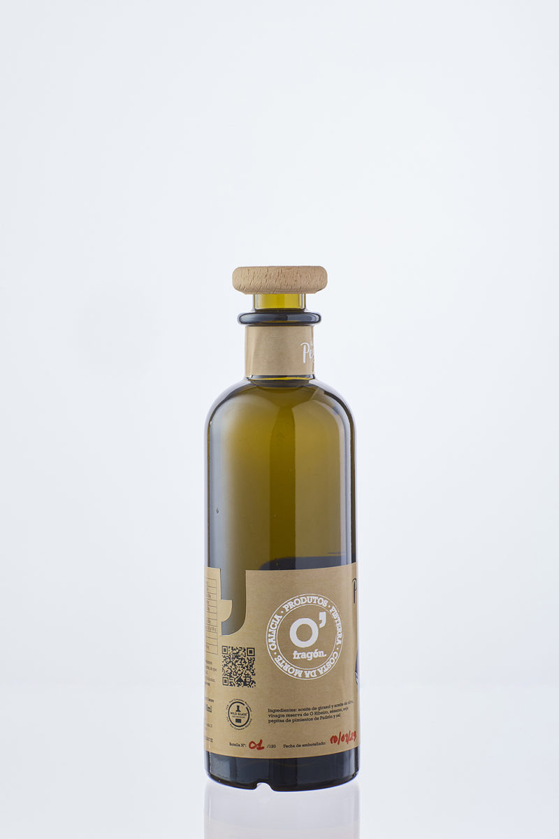El caso de los aceites aromáticos O’Fragón es cuanto menos curioso, nacidos en el seno del famoso restaurante gallego O’fragón como parte de su exclusiva oferta culinaria, fue la alta demanda «para llevar» de los comensales lo que empujó a la gerencia a plantearse una apertura al gran público… acertaron de lleno. Semejante tarea debía ser encomendada a alguien que conociera la tierra, su valor, historia y futuro. De esta forma llegaron a Sistema Diseño, el legendario estudio coruñés dirigido por Manuel Fraga y David Rivero.