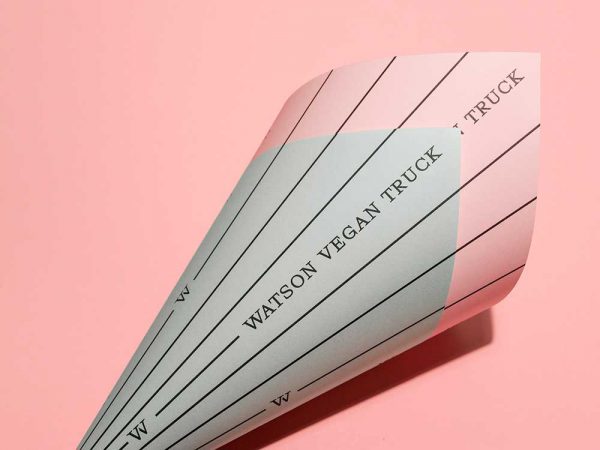 Watson Vegan Truck es una furgoneta de comida vegana que vende hamburguesas en las carreteras suizas. La identidad visual del proyecto es obra de Donovan Bernini, un diseñador gráfico suizo especializado en diseño editorial y tipográfico. Inspirado por los festivales de food trucks en los que los propietarios de estas camionetas gastronómicas ofrecen una pequeña selección de platos y productos propios, como cervezas, Donovan Bernini decidió apostar por una identidad visual que mezclara el mundo de la comida rápida, estrechamente ligado a la hamburguesa, con los códigos gráficos de productos premium, como el uso que se hace del color y un diseño gráfico de líneas refinadas. Por otra parte, así como los food trucks cuentan con una fuerte identidad culinaria, Watson Vengan Truck es un homenaje a Donald Watson, fundador de la Vegan Society en 1944, y cada uno de los platos del menú lleva el nombre de figuras históricas que adoptaron el estilo de vida vegano. En cuanto a la tipografía, se optó por el uso de letras capitales para darle un aspecto artesanal a la marca corporativa.