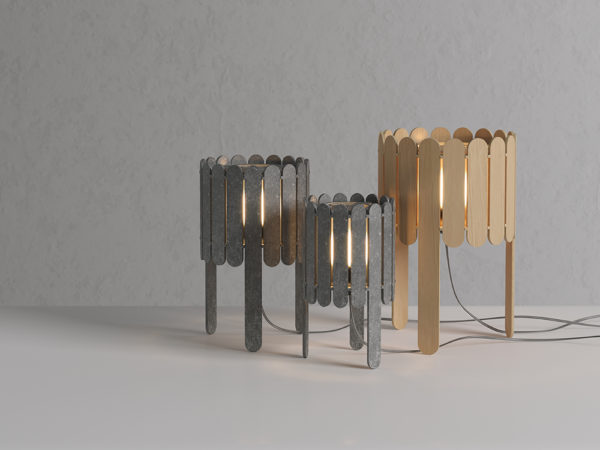 En esencia, cada Medusa se constituye de 15 listones de bordes redondeados, dispuestos verticalmente con una ligera separación entre ellos. Esta suerte de rejilla, unida por dos tapas circulares con surcos concéntricos, hace las veces de pantalla difusora y estructura principal. La patas se consiguen con la prolongación natural de tres de estos delicados flejes. Brillante.