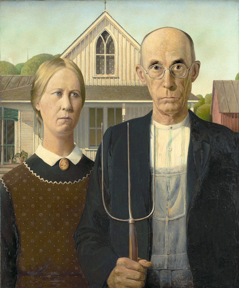 En 1930, Grant Wood pintó American Gothic, una de las pinturas más reconocibles del arte estadounidense. Utilizando como motivo de fondo una pequeña vivienda neogótica y su pretencioso ventanal, ideó una composición con dos figuras, su hermana Nan y su dentista, Byron McKeeby (Turner, 2022). La pareja simulaba a un padre y su hija, en un estilo inspirado en los primitivos flamencos, cuya minuciosidad le había llevado a abandonar su primera devoción por el impresionismo. American Gothic podía verse como una representación irónica de la América profunda, pero también como una exaltación del modo de vida de los campesinos blancos. La obra recibió un tercer premio en un certamen del Art Institute of Chicago que se quedó con ella por tan solo 300 dólares (Milosch, 2005, 300).